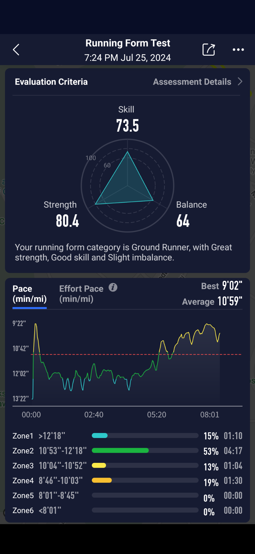 For reference, the 5k pace of my last race was 12min/mi. The warm-up for this test was at that pace. The actual test was a challenging pace. The test basically says that I am a ground runner vs. an aerial runner. The difference being the amount of time my feet are on the ground. There isn’t a right or wrong category for a runner. The skill section indicates my ground time, landing angle and stride ratio are all good for a ground runner. The strength section indicates good leg stiffness and great reaction force. My balance is slightly off with my right foot having more ground time than my left.