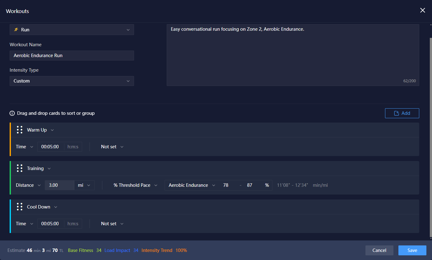 The running workout today was listed as an easy run. It was not so easy after taking several days off. The workout ended with stride repeats. The session warmup was not nearly long enough for me. I believe this likely contributed to the overall workout feeling more difficult than normal. My training plan is integrated with my GPS/Sports watch (Coros Pace 3). The watch tells me exactly what I need to do for each training run. Here is a screenshot showing what a workout looks in the training hub.