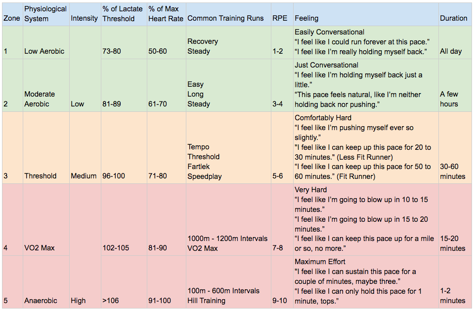 The following chart shows zone information corresponding to Pace (column: % of Lactate Threshold), Heart Rate (column: % of Max Heart Rate) and Rate of Perceived Exertion (columns: RPE and Feeling)