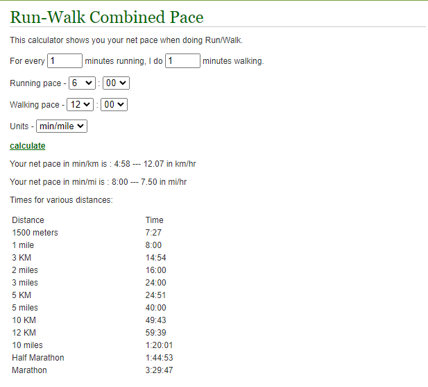 There is also a run/walk strategy that you can use, especially on longer distances, to keep pace and improve finish times. This strategy was developed by coach Jeff Galloway and he trademarked it Run/Walk/Run. The idea is that you run for a set period at faster pace than your usual (since you don’t have to sustain this pace for a long period) and then follow it up with a set period of walking. The set period can either be time based or distance based. An example would be running at a 6min/mile pace for 1 minute followed by walking for 1 minute. You repeat this for the entire race or just a portion of it. Whatever works best for you. There are online calculators that will help you determine paces for running and walking and the interval times.