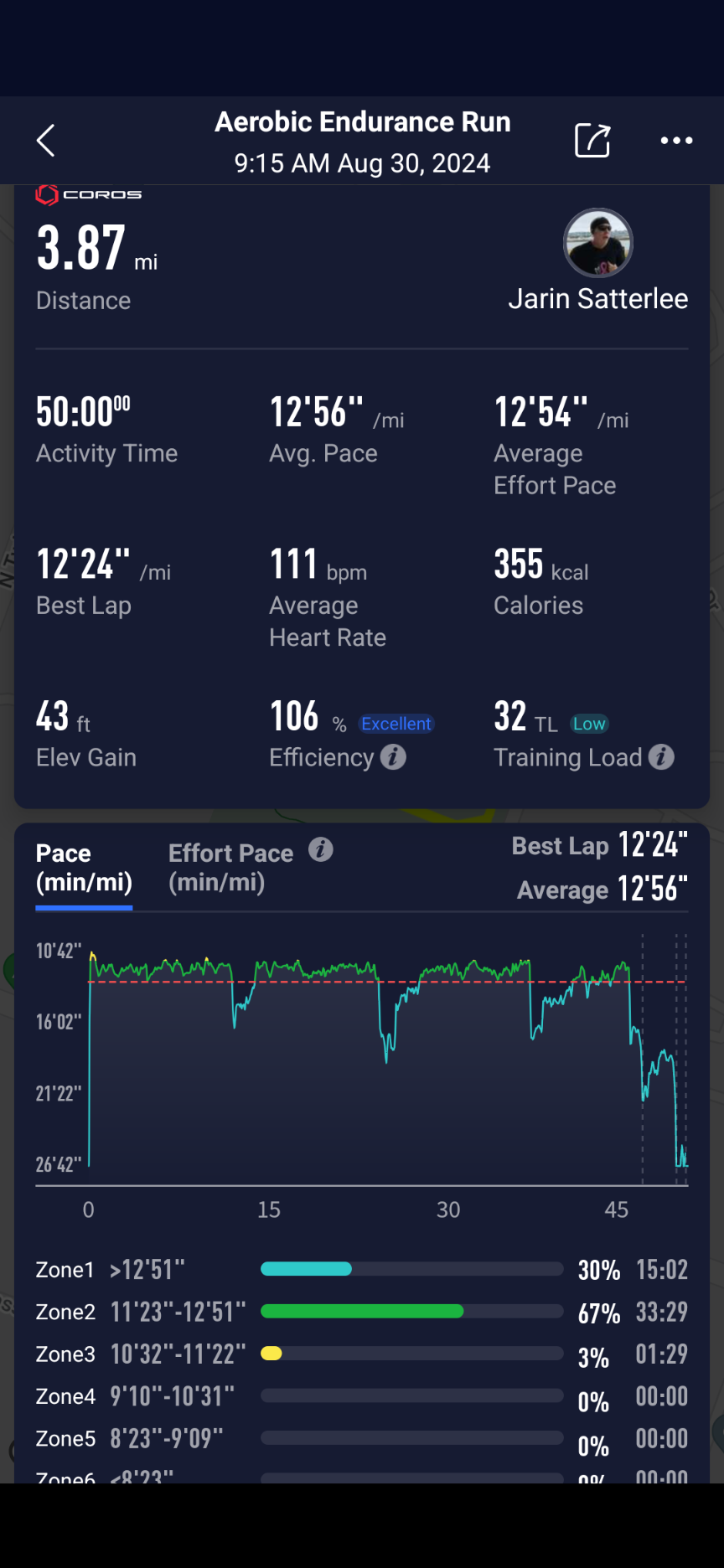 The Aug 30 run was OUTSIDE!!!! We had a thick enough marine layer to stave off the sun until well after 10am. I was able to get a really good workout done on good ole mother nature’s skin. I could have pushed a bit harder, but decided to stay at the top end of my workout zone. It was, after all, an endurance run so I needed longevity not speed. You will notice dips in the pace graph, this is walking. Every mile I walked for a bit and slowly ramped back up to my workout pace. The reason for this is simple. Heat. I’ve ended each run in the past 2 months absolutely dripping. This wasn’t typical in the cooler months. Yes I would sweat but not so much that there was a trail of drips as I walked. Really its the humidity along with the warmer temps that does me in.