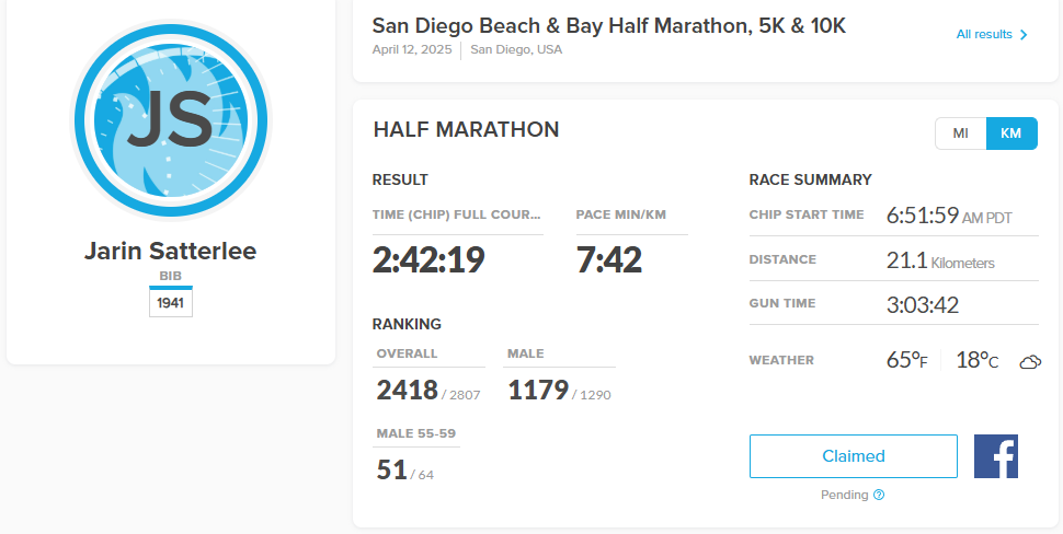 The race started off really well. The first mile down, I was like… already? The first 6 miles went smooth and felt good, minus having to stop around mile 3 to tinkle and having to wait. I lost about 3 minutes off the pacers and spent the next 3 miles catching up to them. Mile 7… Houston, we are losing power. Mile 8… I’m so done with this race. I had to bargain with myself and convince myself if I could just get through the next 2 miles to mile 10 then it will only be 3 more miles and that is nothing. Got over the mental hurdle at mile 10, but the legs were offline or something and didn’t get the message. I made it though. I was way behind my goal time, but so what. I still finished! But boy am I paying the price now….